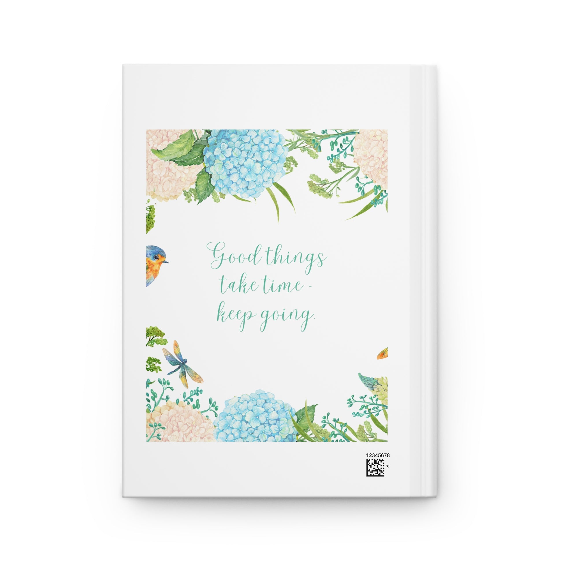 A journal with a matte laminated cover featuring a 'good things take time' design. Perfect for those who appreciate the journey and process of achieving goals. Ideal for journaling, note-taking, or sketching. Relevant for graduation gifts, New Year's resolutions, and personal growth milestones.